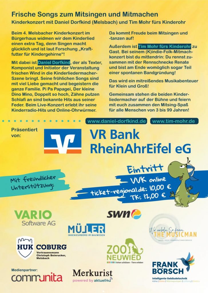 Bereits zum vierten Mal verwandelt sich das Bürgerhaus in Melsbach in eine fröhlich-bunte Musikbühne für kleine und große Musikfans. Freut euch auf ein mitreißendes Kinder-Mitmachkonzert mit Daniel Dorfkind aus Melsbach und seinem diesjährigen Gast Tim Mohr!